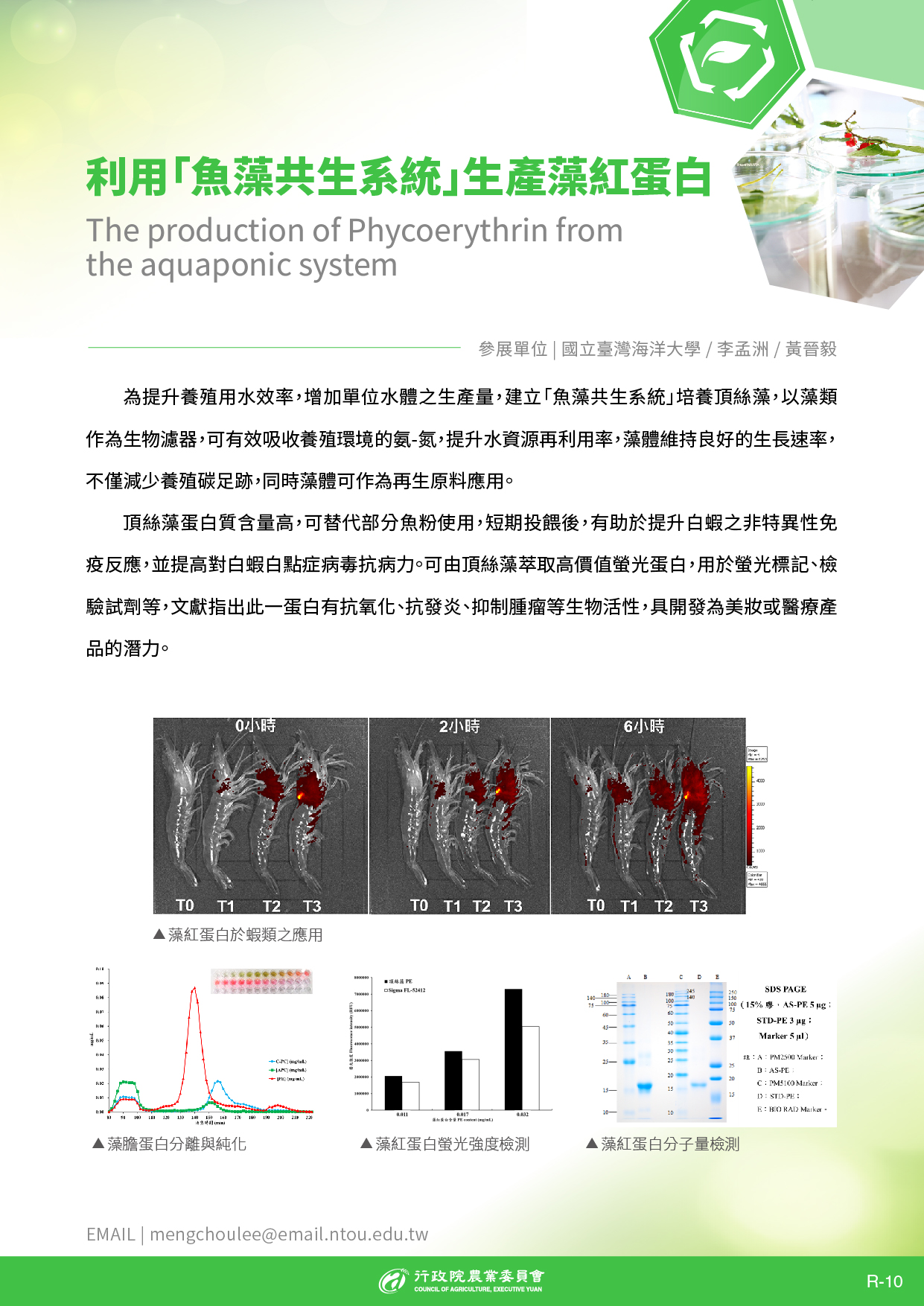 海洋大學李孟洲教授與藻類培育暨生技實驗室團隊,於2019亞洲生技大展,展出利用「魚藻共生系統」生產藻紅蛋白(R-phycoerythrin)。為提升養殖用水效率,增加單位水體之生產量,建立以「魚藻共生系統」培養頂絲藻,利用藻類作為生物濾器,可有效吸收養殖環境的氨-氮,提升水資源再利用率,同時藻體維持良好的生長速率,可減少養殖碳足跡,藻體可作為再生原料進行應用。